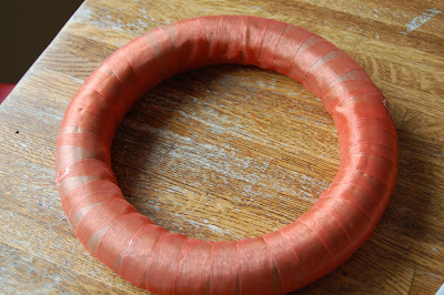 The first thing I did was use some old ribbon that I had in my stash to wrap the form. This is so the hot glue doesn’t melt the styrofoam and so that the ugly green styrofoam doesn’t show through the spaces between the candy.