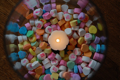 I bought three bags of conversation hearts, one spool of Valentine ribbon and a styrofoam wreath form. I already had the hot glue and the ribbon that I used to wrap the wreath before any hot gluing took place. So, this little lovely only cost 4 dollars! 🙂