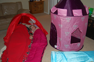 Kevin had the fun idea to have a movie night with the bird last week. We’ve let her stay up with just us to watch a movie only once before. So, it’s a pretty big treat. But, to make this even more of a special event, he decided that they would “camp out” in the living room. My parents got her a cool sleeping bag as part of her Christmas gift and she wanted to test it out.