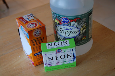 Then (using a different spoon), put some baking powder in each of your ‘food coloring spoons’ so that you can’t see what color is underneath.