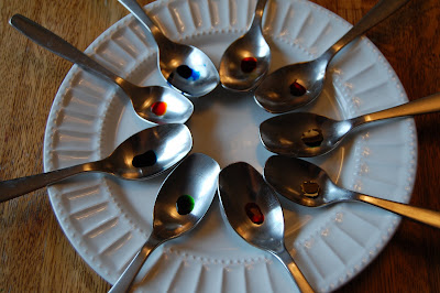 Arrange your spoons and put a few drops of food coloring in each spoon. I added more than one color in some spoons so that we would have a bunch of different colors. (you know…red + yellow = orange and all that) 🙂