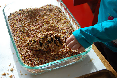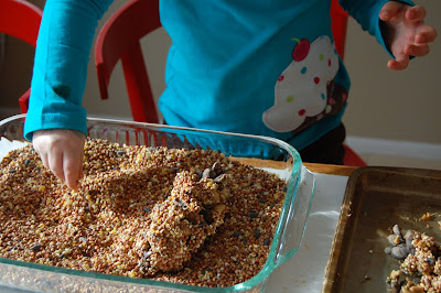 Lucie thought it was the best. She loved making it and she loved watching the birds enjoy it. We made these little beauties last year by cutting out toast and spreading peanut butter on it and then dipping in birdseed. That was a great project too – but this year we went with a mobile.