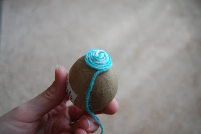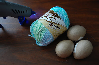 I made a line of hot glue and wound the yarn around the egg. I repeated until it was covered.