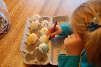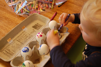 The whole melted crayon thing works so well. The eggs turn out so pretty and vibrant. Even the bean could make some really artistic looking eggs with this fun process.