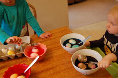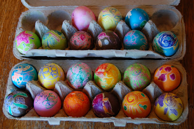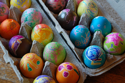 The eggs were cool looking when they were just white with crayon, but dying them made the funky designs the kids had drawn really pop! The finished product is so pretty.