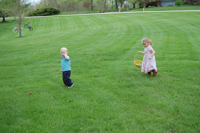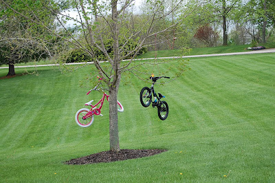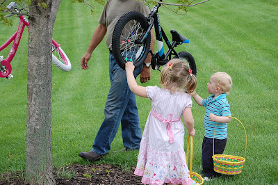 So, the ‘big’ kids got bikes for Easter from my parents. My dad wanted to hide them so they could find them during the Easter egg hunt. See them “hiding” in the tree over there! 🙂 The kids did NOT see them. It was so funny. They were only looking down for eggs. It took them forever to figure it out. haha. silly kids.