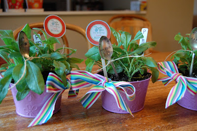 I bought forget-me-nots (clever, right!!? haha) and put them in sweet little tins from the Dollar Tree. I added some colorful ribbon and then I printed the flower pick.