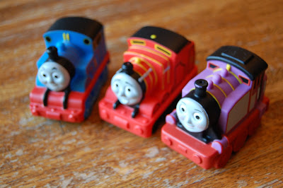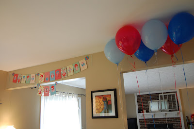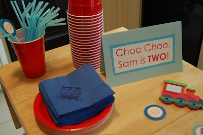 I started my quest for train related items at the party store. I was VERY disappointed that they have tons of train stuff, but it’s all Thomas. I don’t hate Thomas (well, sometimes I do – I think he’s kind of mean to the other trains…. and that theme song, for the LOVE are they TRYING to make me insane?). I DO enjoy that he’s blue and red. I also dig that he’s British. And I think it’s cool that he was first a book series from the 40’s. Of course, I do like that he’s anthropomorphized…but who doesn’t like big words for talking trains? But we never watch it. I think Sam has only seen it while we were in the hospital. I don’t think we get that channel. Plus I don’t love throwing parties with all syndicated character stuff, when it’s so easy to DIY! I know that someday the kids will request characters for their birthday stuff, so I am enjoying the DIY while I can. 🙂