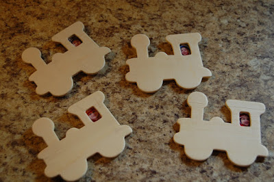 I glued the kids faces into the windows of these little 25 cent wooden trains from Hobby Lobby. Then I glued magnets to the back. The kids colored them.