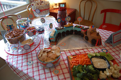 We made train shaped tortilla chips for the hummus! Cut out whole wheat tortillas with cookie cutter, drizzle with olive oil and salt, bake till crispy. Thanks Darleen! My mother in law cut them all out! 🙂