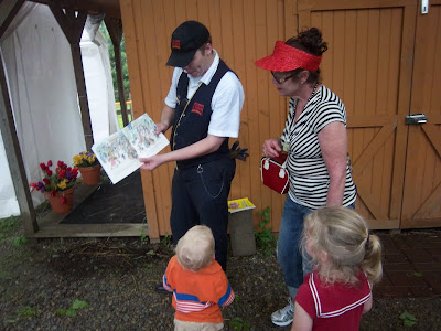 The day we went it was the “Curious George Excursion.” So, during the ride ‘the man in the yellow hat’ (it was a lady) came around and made balloon animals for the kids. And at the layover we got to meet Curious George. And the conductor read the kids Curious George books. And they did Curious George related crafts. It was really cute.