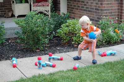 The bean didn’t have a bowling set…..so I set out to make him one. First I had to collect 10 empties. The office in one of my schools goes through at least one a week…..so they started saving them for me too. I ended up with MORE THAN ENOUGH. So, I made a set for my friend Tracy’s little boy too!