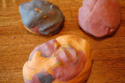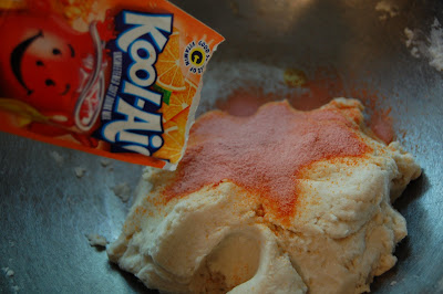 Then I separated it into three balls. I added two packets of orange kool-aide to one, two packets of black cherry kool-aide to another and two packets of grape kool-aide to the last. And I mixed it all up.