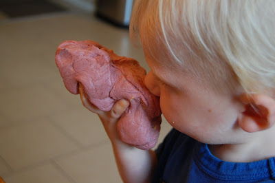 Mix up all the ingredients (except the kool-aide) until they are the consistency of clay. I added the water a half cup at a time and didn’t end up using the whole 2 cups. (Add more water if it feels dry and more half flour/half salt if it seems too sticky! 🙂 Makes sense.)
