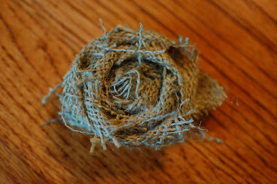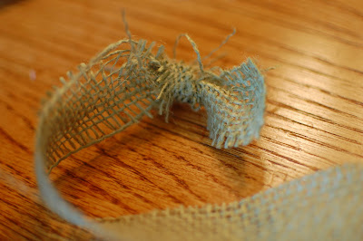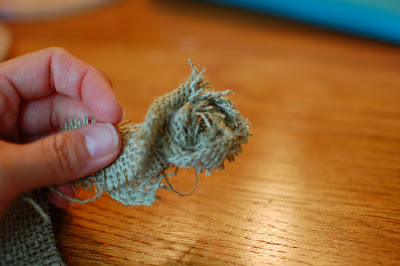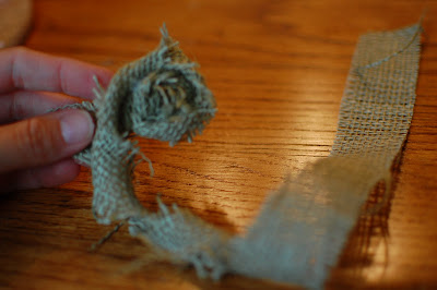 Next, you will begin the process of twisting the burlap and gluing it to itself as you twist. Twisting the fabric and securing it with glue about every half inch or so as you wrap it around.