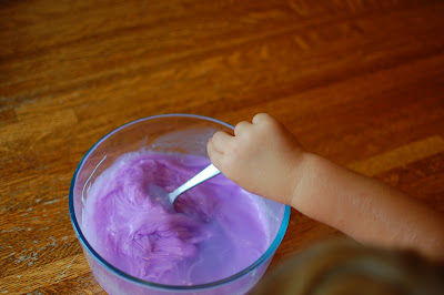 1. Mix together 1/2 cup warm water, 1/2 cup Elmer’s glue, and food coloring. Stir thoroughly and set aside.