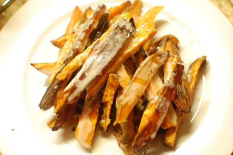 I cut three sweet potatoes into fries. Drizzled them with olive oil. Sprinkled with salt and pepper. Roasted at 425 for 30 minutes. They were all crispy and roasted on the outside and soft on the inside. Right before I served them I threw a few tablespoons of this coconut butter on top.