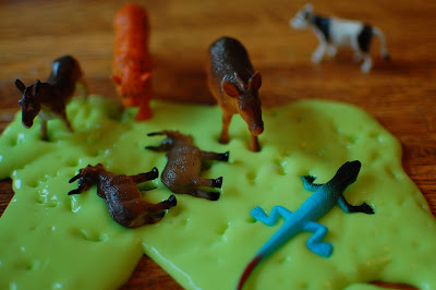 Then you can hold it, roll into a ball, let it ‘drip’ through your hands, let it become an oozing lake for your animals, hide your toys in it and then break it up to find them. Fun. fun. fun! You can even stuff it into a small cup and it makes funny, inappropriate noises. 🙂